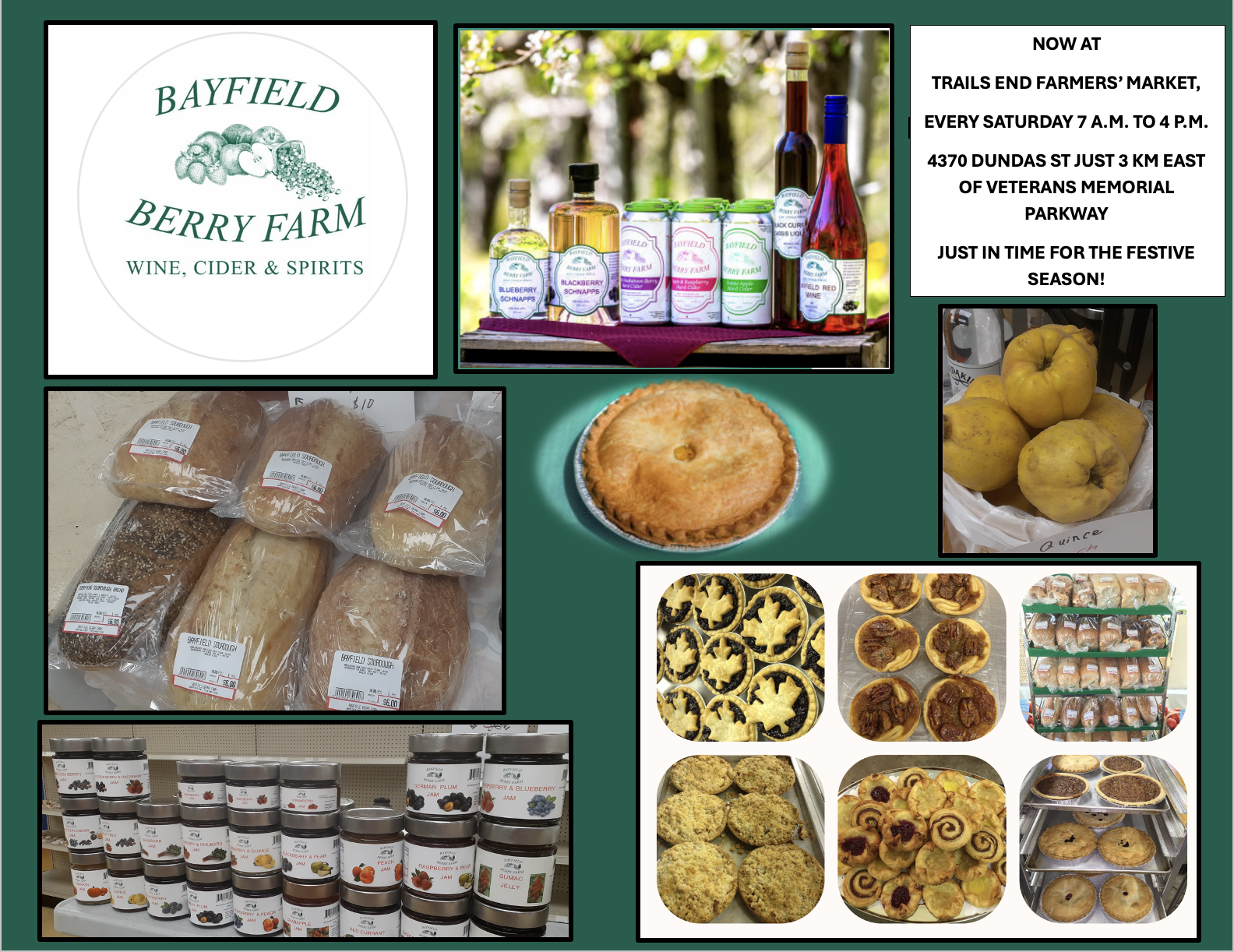 BAYFIELD BERRY FARM, established in 2001 in Bayfield, offers the fruits of their labour. Visit the Farm Retail Market now at Trails End Farmers’ Market for baking, preserves, ciders, alcoholic beverages, frozen fruit, jams, and so much more.