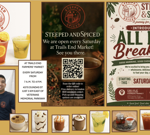STEEPED AND SPICED AT TRAILS END FARMERS’ MARKET! At Steeped and Spiced, Crystal and Arjun specialize in premium teas, exquisite tea accessories, and high-quality spices sourced from around the world.