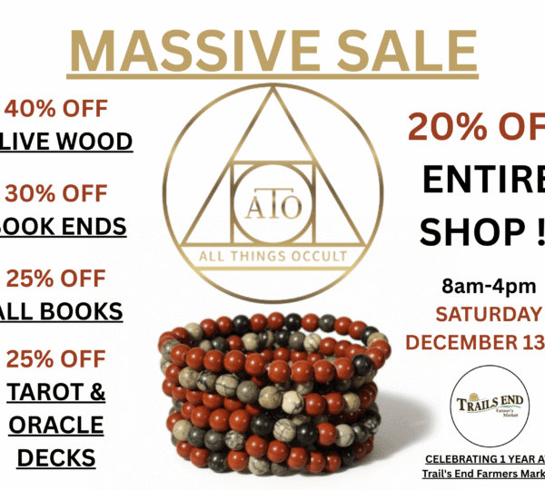 ALL THINGS OCCULT–ATO Celebrating ONE YEAR at Trails End Market!! Come in and join in our celebrations with great savings–just in time for the festive season!! Every Saturday at Trails