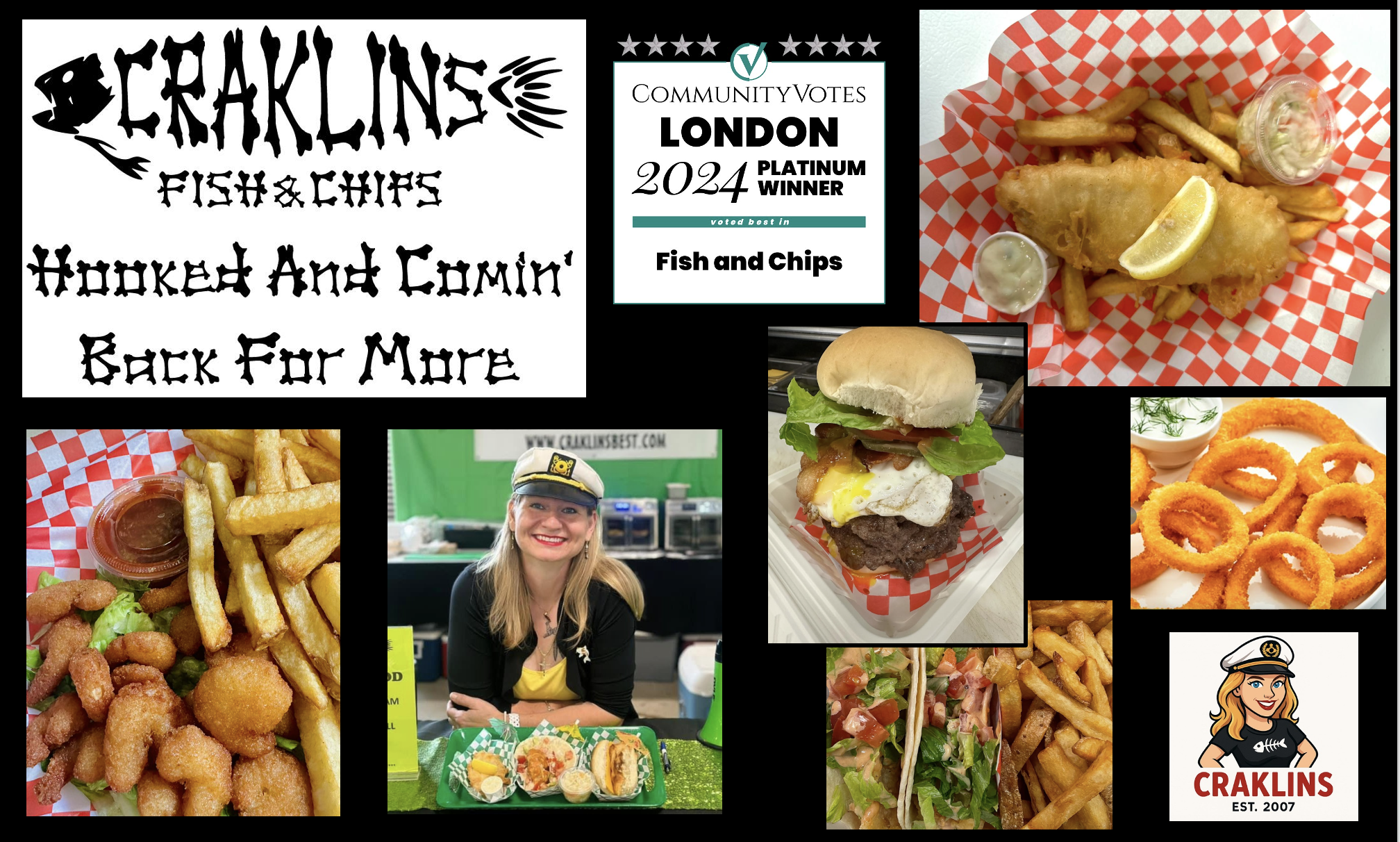 CRAKLINS FISH & CHIPS is at Trails End Farmers’ Market every Saturday from 7 a.m. to 4 p.m. Owner Lina Marie has been in operation since 2007 and is the winner of the Community Votes London for Best Fish and Chips Award three years running.