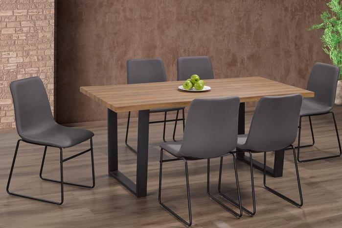 Make an impact in the dining room with this live edge dining set. The 2″ thick, distressed oak veneer table top contrasts perfectly with the thick, black metal legs to create a look you will love to entertain on for years to come. Includes contemporary dining chairs draped in beautiful bonded leather, and include a curved, wider seat and steel support legs. 2 chairs per box.