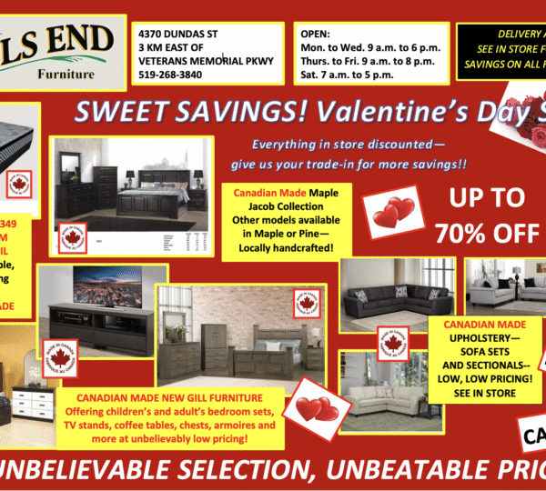 SWEET SAVINGS at Trails End Furniture FOR VALENTINE’S DAY! UP TO 70% OFF REGULAR PRICES! Give the gift of comfort! Something special for your loved one! Take a look at